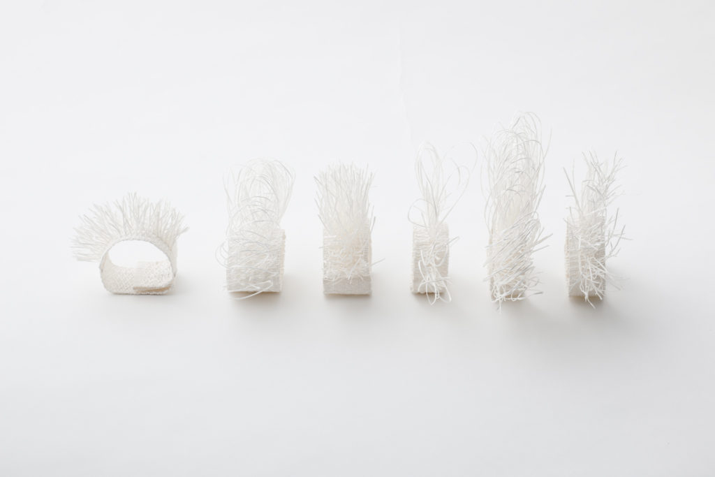 細くカットして撚った紙の糸のうごきを、スッと伸びたりゆるっとカーブを描いたり、有機的に表現したブレスレット。いつもはタテ糸にヨコ糸を交互に入れて平らに織ることが多いですが、これはラグなどに使われるノッティングの技法で立体的に織りました。素材の紙が軽いため、つけた感触も見た目以上にとても軽やか!留め具には足袋用のシルバーのこはぜを用いています。