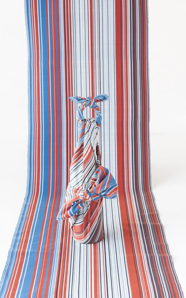 一枚の絵から縞(しま)をデザインし糸を染め、昔ながらの日本の織機を使って、着尺を手織りしました。ストライプのタテ糸の色の切り替えから、表情のリズムが広がっていきます。黒いタテ糸を二本を一本にするとその緊張がさらに高まったり、同色でまとまった幅をつくるとまったりと緩んだり、最もシンプルでありながら奥深い、縞のデザインはそう思わせてくれます。(やはり民芸館にある着物の生地や、ヴィンテージのシャツなどに使われているストライプやチェック柄は見応えがあります!)